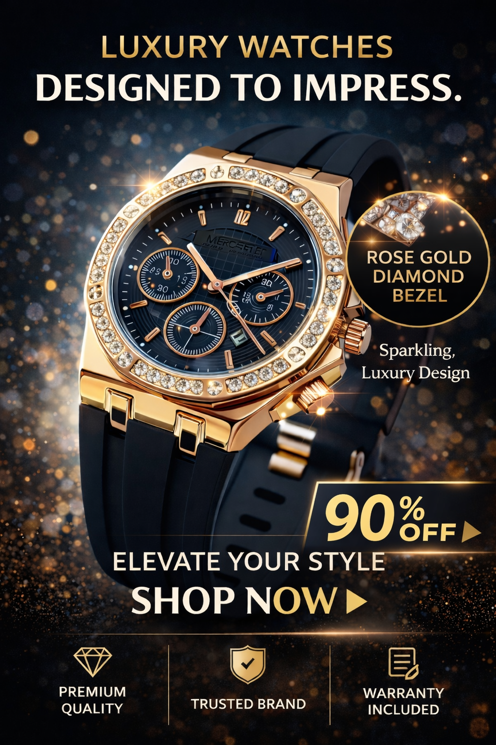 | Style & Appearance | ⭐⭐⭐⭐⭐ | High‑impact luxury look with crystal‑studded bezel and black dial. |