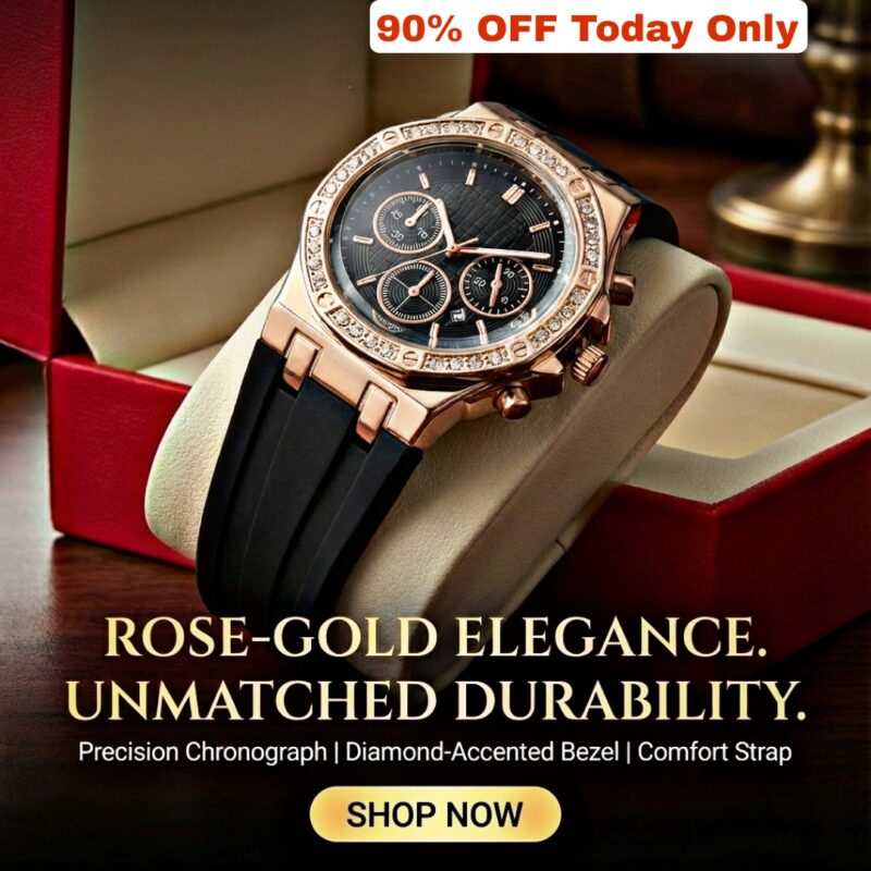 - Case & Bezel: Rose‑gold tone alloy case with a geometric silhouette and a crystal‑lined bezel that reflects light for a diamond‑inspired sparkle.