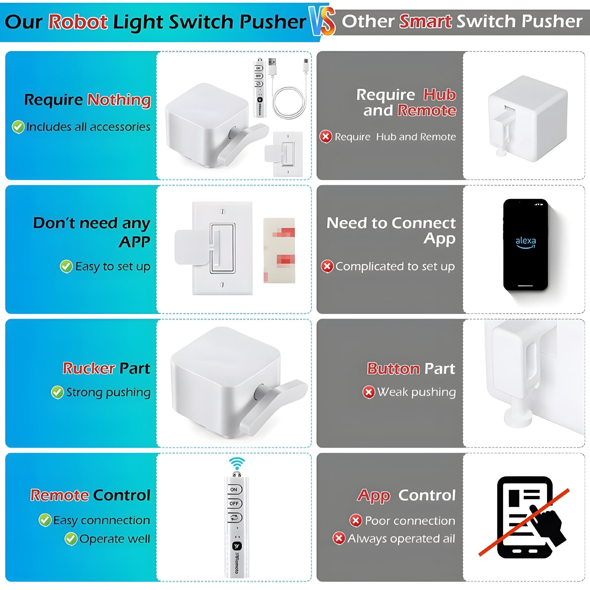 | Smart Compatibility | Works with most wall switches & push buttons |
